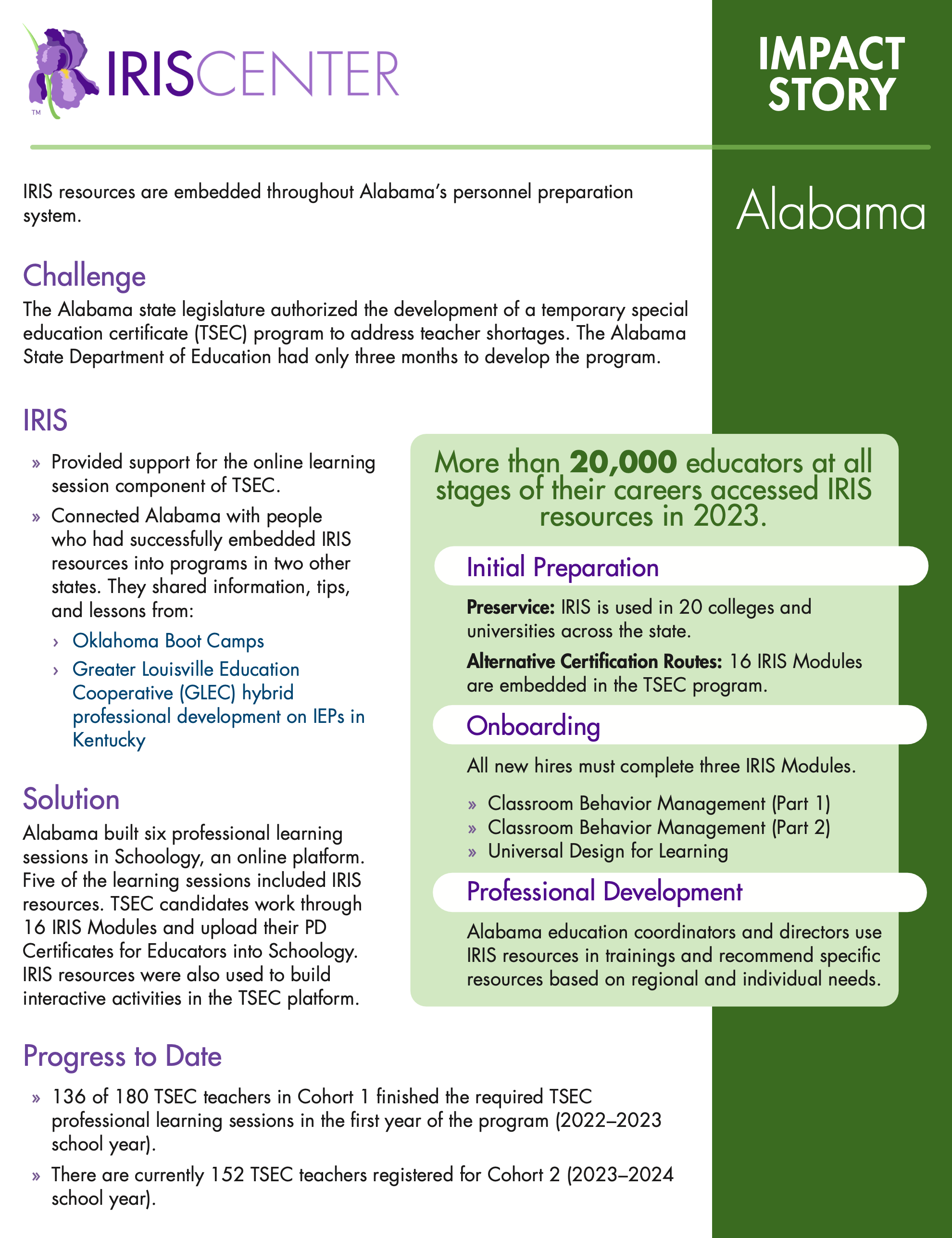 - Alternative Certification Routes: Sixteen IRIS Modules are embedded in Alabama’s temporary special education certificate (TSEC) program, which is further explained in the TSEC Initiative section below.